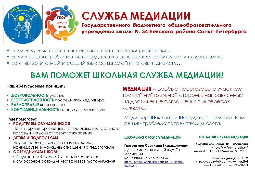 СЛУЖБА МЕДИАЦИИ объединяет обучающихся (воспитанников), педагогов и других участников образовательного процесса, заинтересованных в разрешении конфликтов и развитии практики восстановительной медиации в ГБОУ школе № 34 Невского района Санкт-Петербурга и является элементом системы сопровождения образовательного процесса.