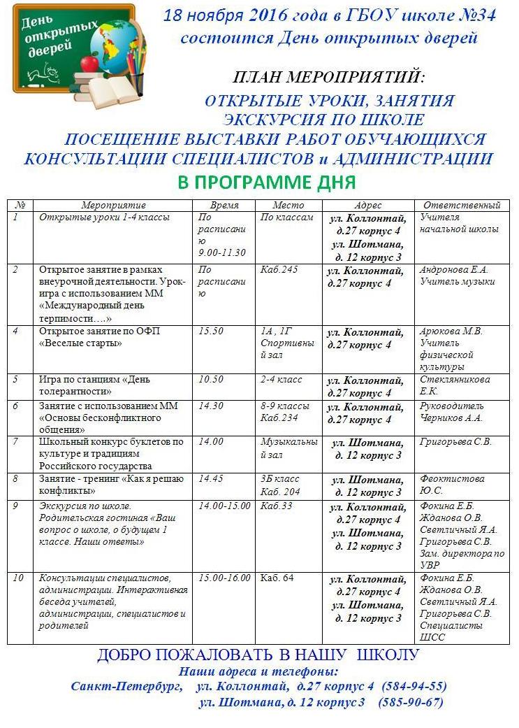 День открытых дверей Категория: Новости 07 Ноябрь 2016 18 ноября 2016 года в ГБОУ школе №34 состоится День открытых дверей